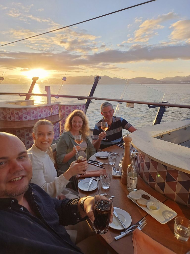 Am Abend wurde es dann besonders schön: Gemeinsam mit unseren zwei Freunden saßen wir auf der Grillterrasse am Heck des Schiffes. Gutes Essen, entspannte Gespräche und ein Sonnenuntergang, der den Himmel in warme Farben tauchte – genau diese Momente machen eine Reise besonders.